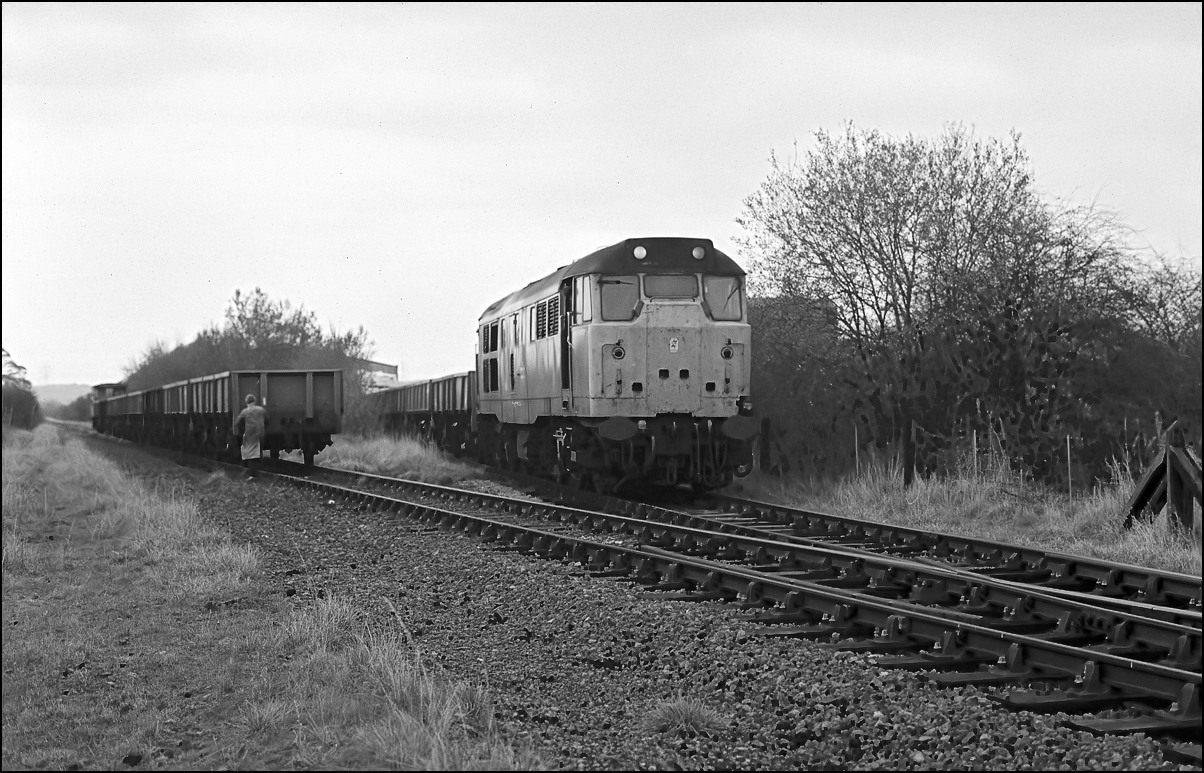 This picture shows 31420 re-marshalling the train which had been split to facilitate unloading. The first half is standing on the branch to Grendon Underwood Junction while the loco is bringing the remaining
