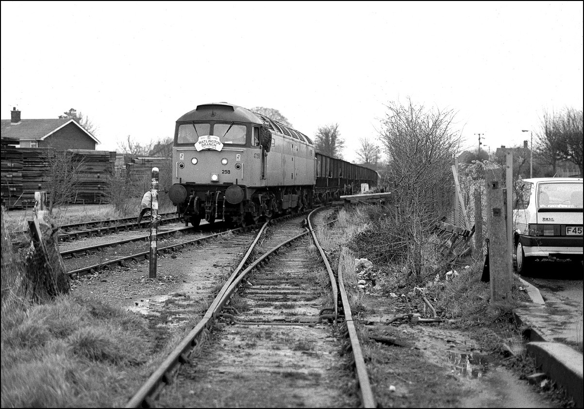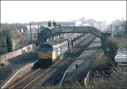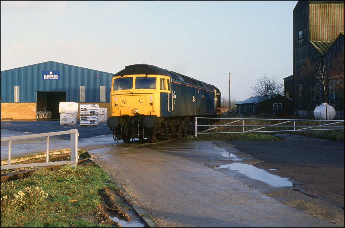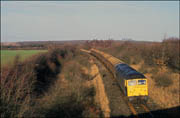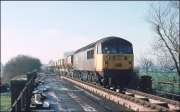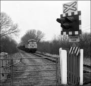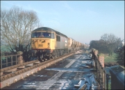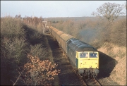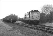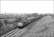In somewhat better light to that seen in the photograph above, 47146 has just about arrived at Grendon Underwood Junction on 5 January 1991 while propelling its train of empty cargowagons from Akeman Street fertiliser depot. The bridge on which I was standing was situated on a bridlepath and subsequently collapsed to be replaced with a boarded crossing.