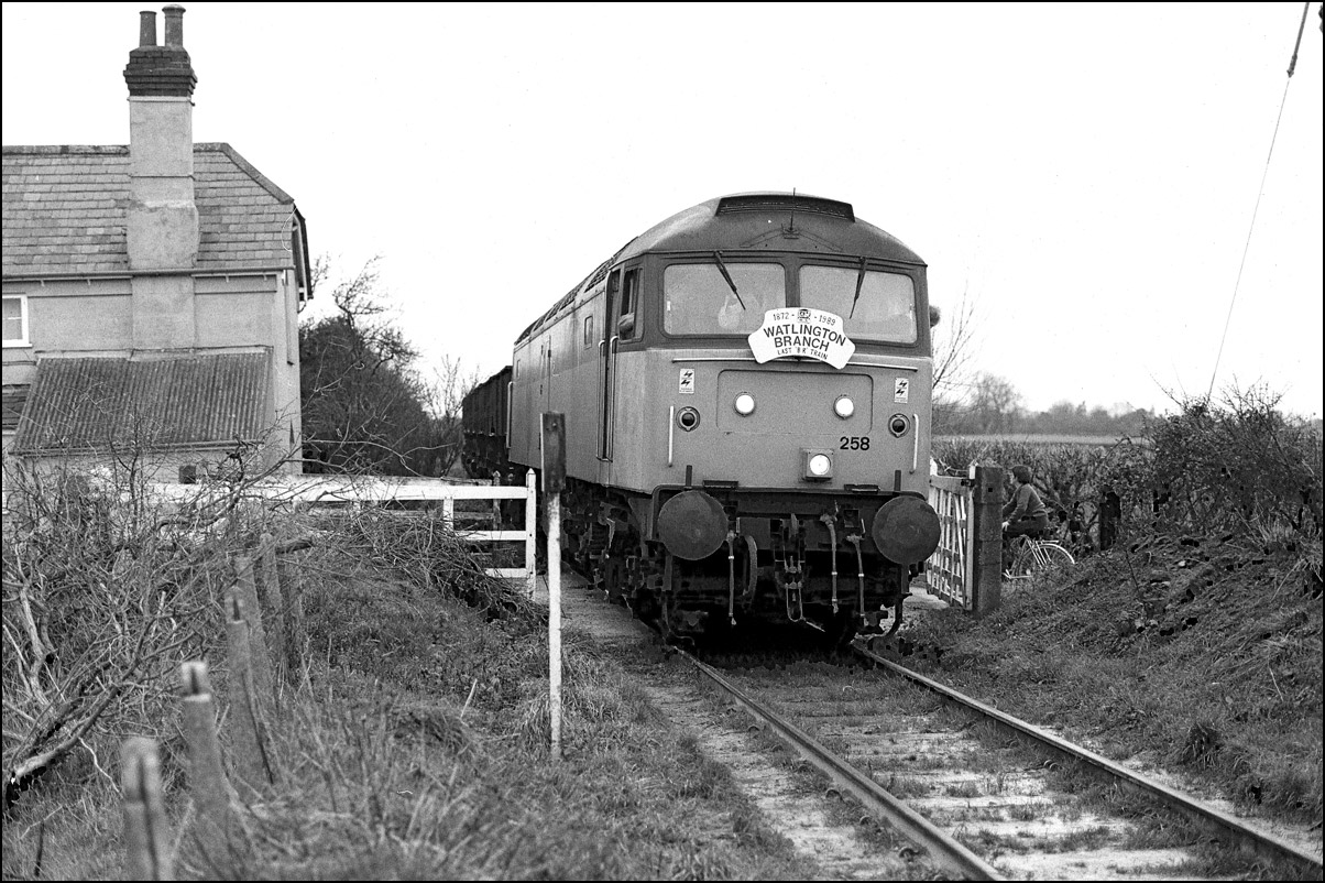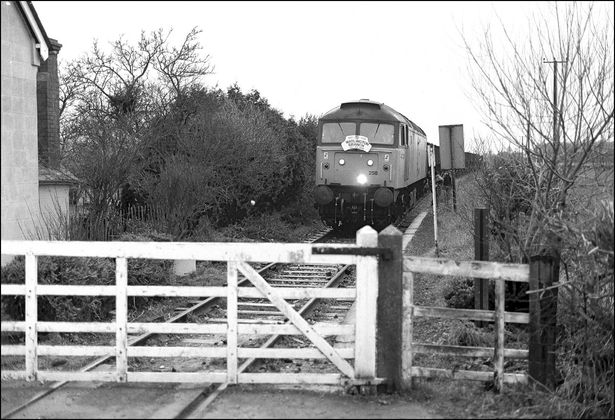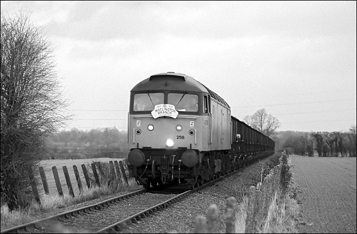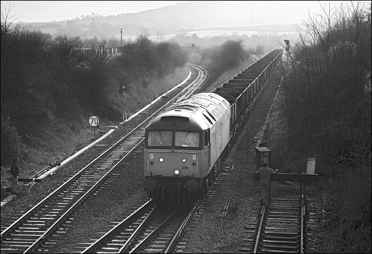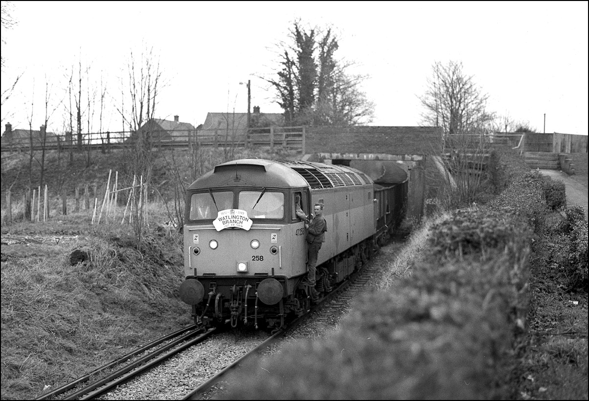 In this, the final picture of this sequence, 47258 is heading over the crosssing at Bledlow, the second man having climbed back into the cab. So ended a most enjoyable afternoon's photography, tinged with sadness that yet another branchline closed to freight traffic.