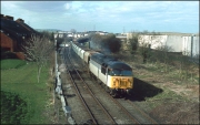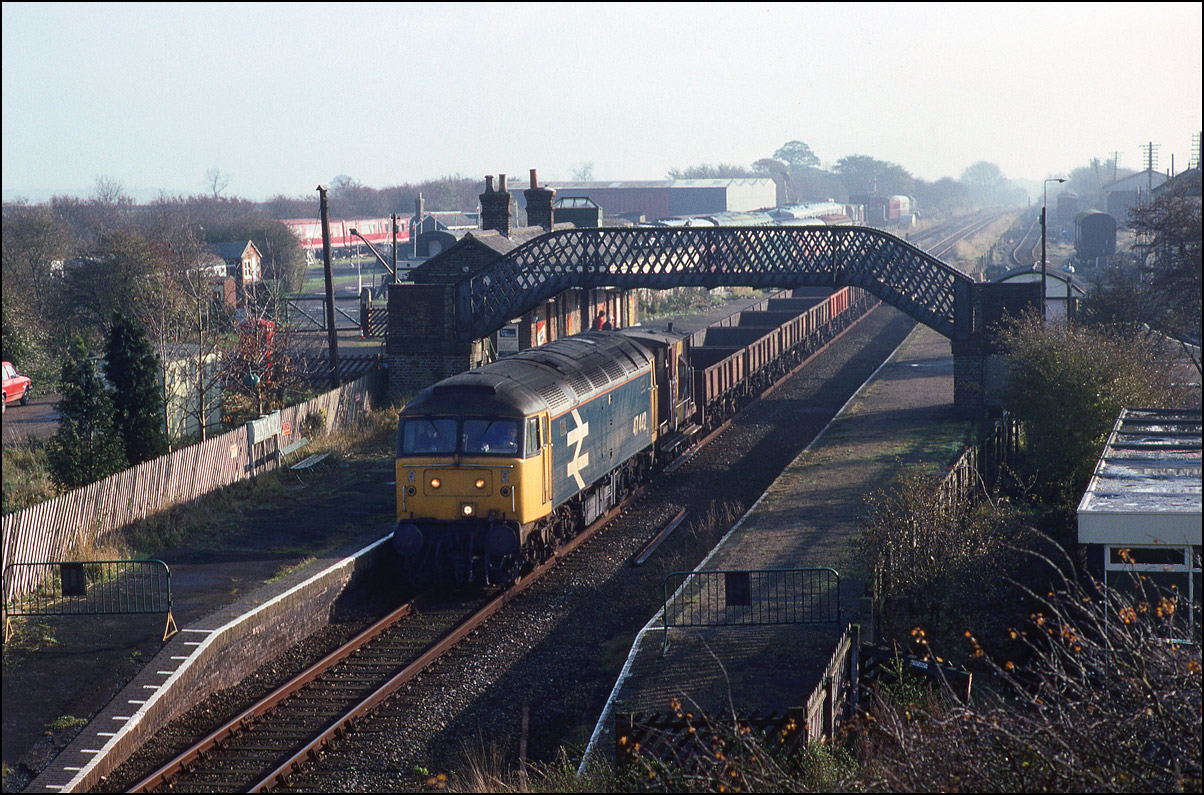 This view of 31420 shows the empty fertiliser wagons from Akeman Street approaching the former station at Winslow on 11 November 1989. An example of the track slewing I mentioned above can be seen here. A view of the remains of Winslow station appears further on in this section of the website.