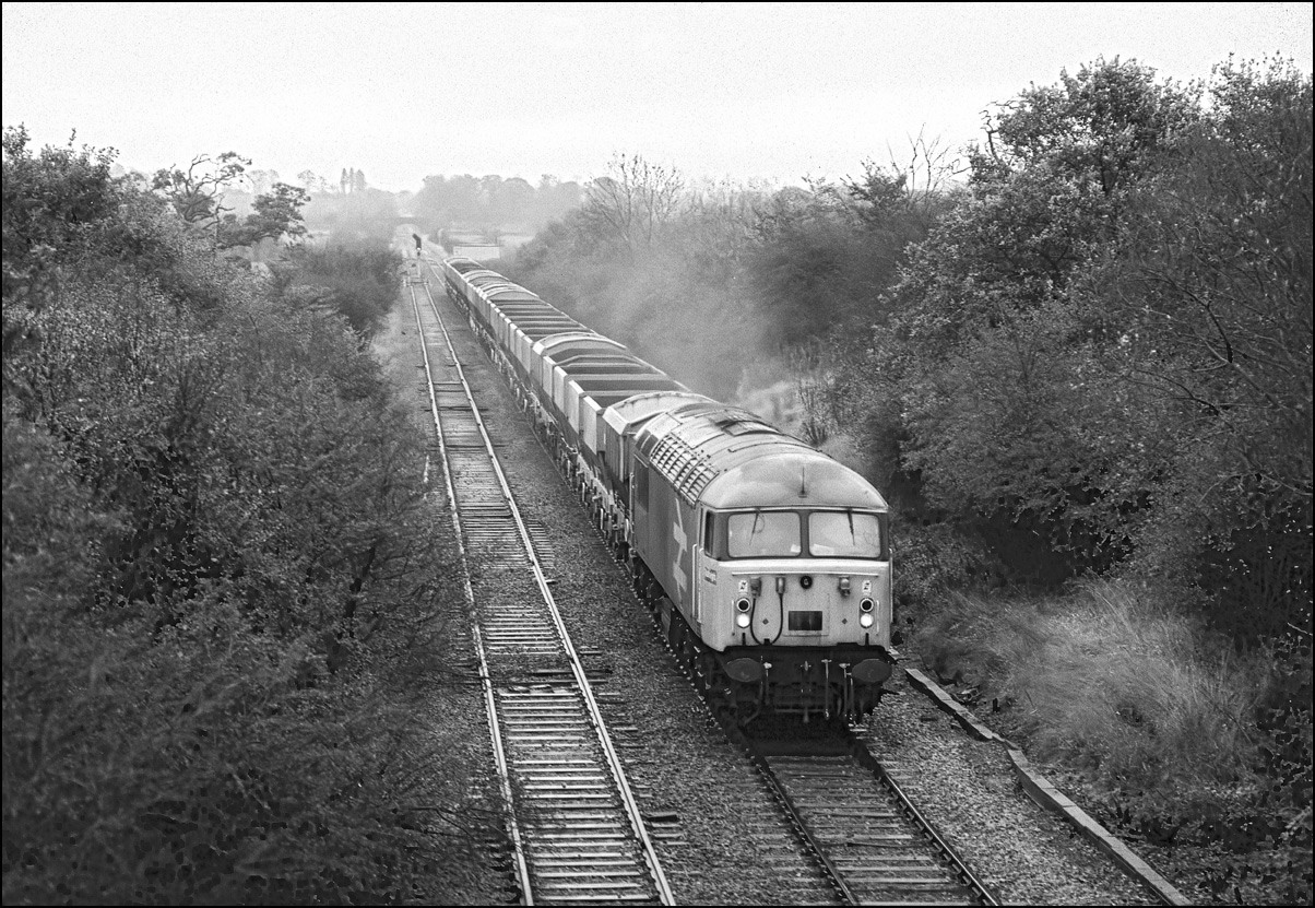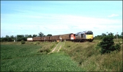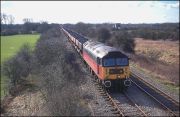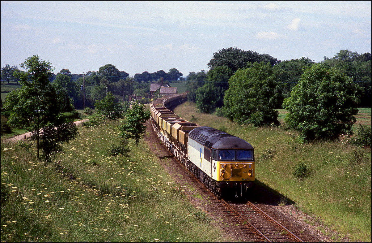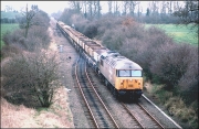 This is a Saturday morning shot of the Whatley to Wolverton loaded stone train, 6M24, passing the site of Swanbourne station on 29 June 1991. This section of line was on a rising gradient for loaded trains and the sound of the 56 was audible for several minutes before the train came into view. I remember this shot well, as I