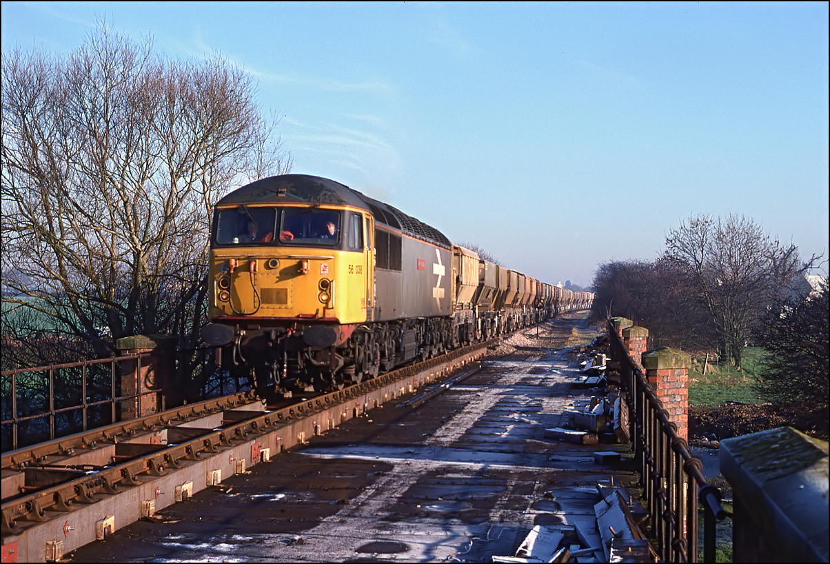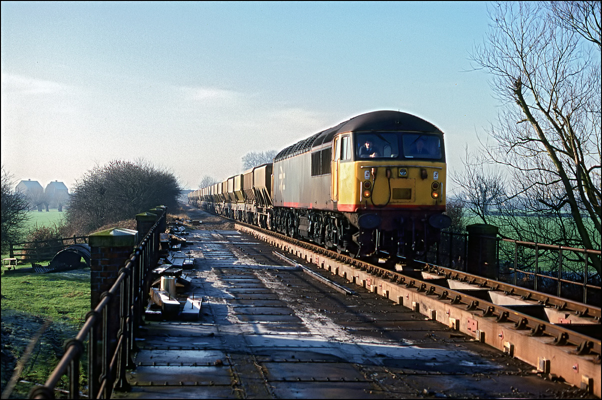 The first shot in this part of the section dealing with stone traffic shows a morning empty stone train, 6V11 from Wolverton to Whatley, behind 56038 on a cold, frosty and bright 17 January 1989. The location is on a bridge over the River Reay near Islip on the former double track section which of course has now, in 2020, been re-double and is a busy