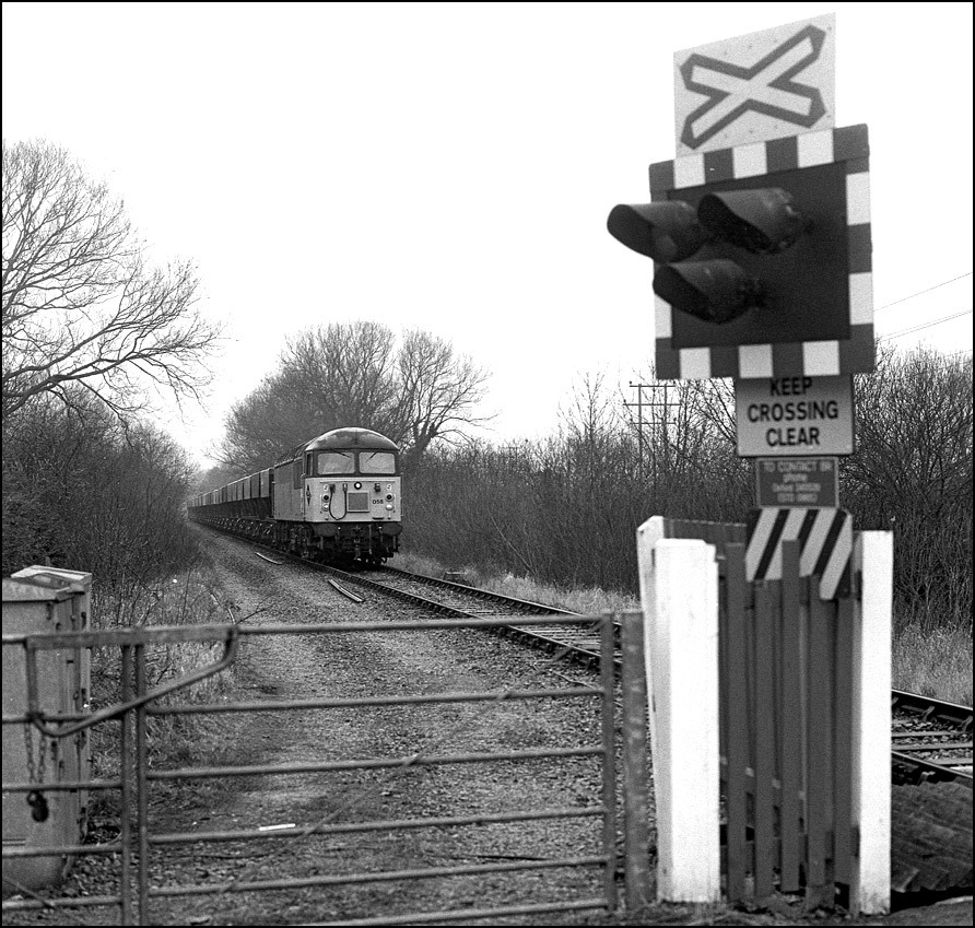 The Toton to Bicester coal train ran again on 12 February 1994 this time with 56058 providing the power. I knew in advance that it was running and as it was an exceptionally dull morning I went to a crossing at Langford Lane just to the Oxford side of Bicester COD where a shot in the sun wouldn't