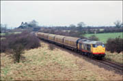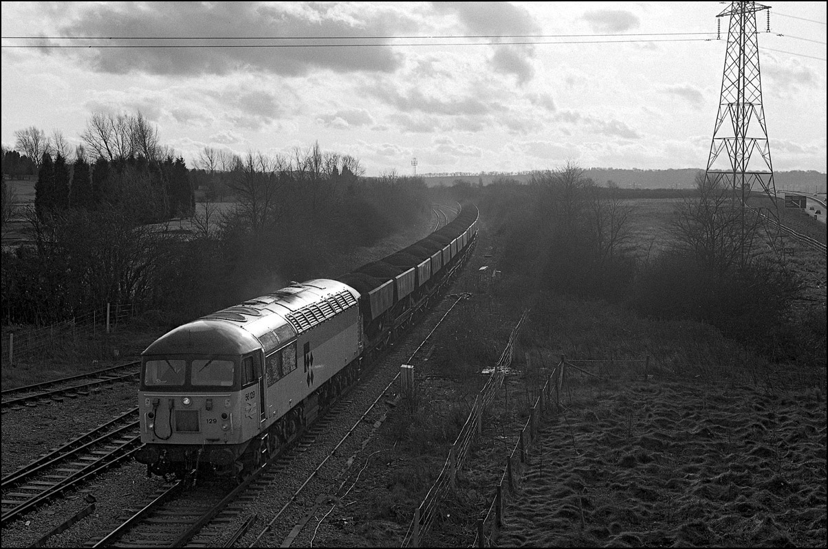 went to Didcot to run around and reverse. On 22 January 1994 56129 appeared on the curve adjacent to Hatton station with one of the usual rake of HTAs. Hatton is convenient for the M40 and a gentle run to Bicester