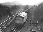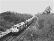 Not longer after 6V11 shown above had cleared Oxford North Junction the loaded train from Whatley, 6M49, appeared behind 56049. The track had not long been singled at the date of this photograph, 17 January 1989. had not long been singled and it appears that the main baulks of timber supporting the remaining track had been renewed. The remaining track was slewed from side to side at various points along the route to take advantage