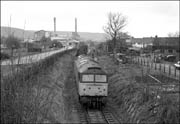 The weather was poor all day and although I did take a few colour slides for the record the black and white images were much better. This one shows 47258 approaching the conveniently placed road bridge which overlooked the cement works in one direction and a tree-lined cutting between housing estates