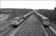 The conditions at Claydon Junction on 18 March 1989 were a little better than in the picture of 56030 shown above as 56040, again with 6V11, passes the exit from the loop. This photograph was taken from the bridge just about visible from the