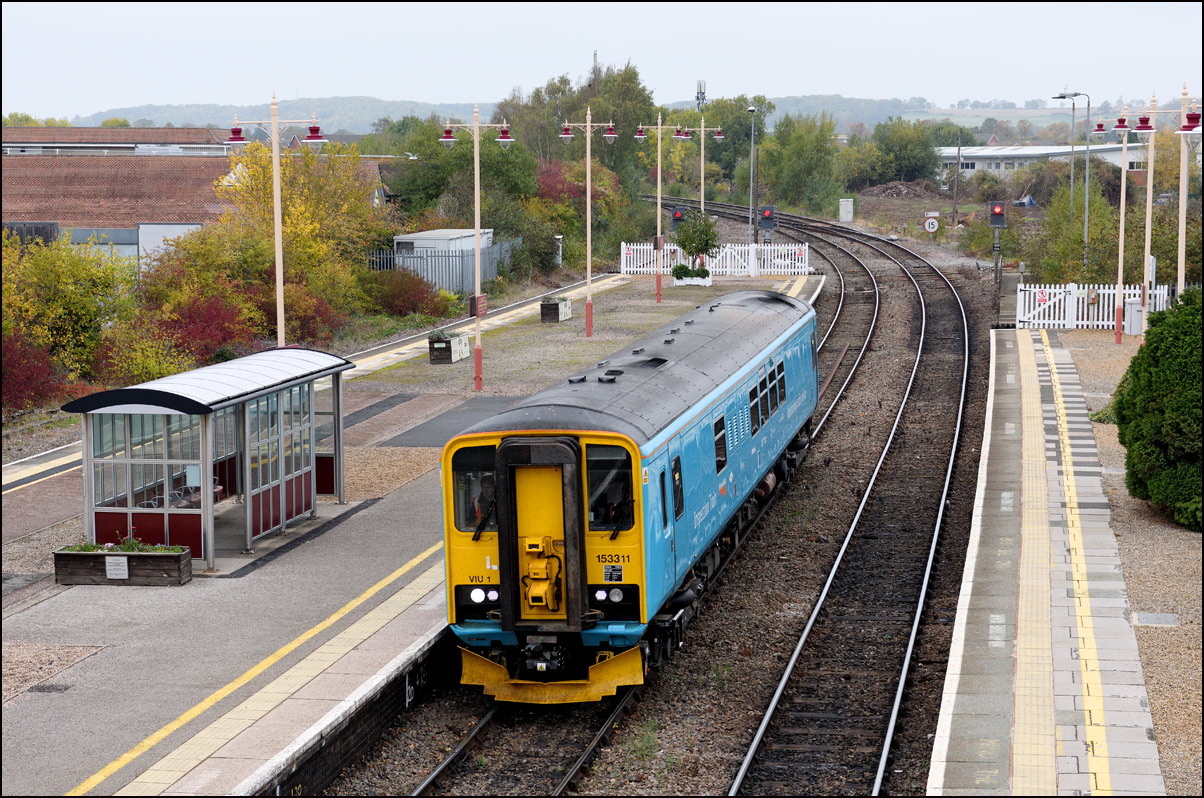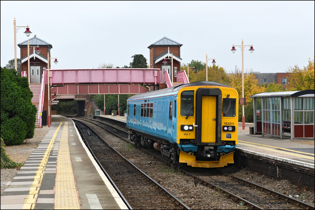 The excitement at Stratford-upon-Avon continued on 14 October 2025 with the arrival of 153311, a Network Rail Video Inspection Unit. Running as 2Q30 it came from Reading Triangle Sidings and visited Stratford twice, the second being a return journey over the North Warwickshire LIne to Birmingham Moor Street. I went for the first visit as it came as booked (for once!) into platform 2 where it stood for about 15 minutes while a class 172, fortunately just a 3 car, left platform 1 for Birmingham Snow Hill and beyond. It was quite a dull and drizzly day; just what was needed for this shot, as the sun would have completely wrong for an arrival here at this time of day. The unit had left Reading nearly 30 minutes late but soon regained the time and reached Stratford 2 or 3 minutes early. |