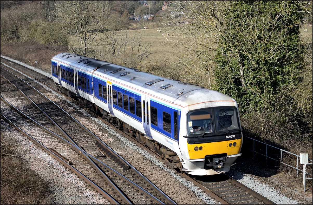 The service offered to those travelling between Stratford-upon-Avon and Leamington Spa is dreadful, a train every 2 hours which is summarily cancelled every time anything happens at Wembley Stadium needed extra drivers for the main line. This is 165010 forming the 10.29 from Stratford about to pass under the footbridge at Budbrook Junction on 6 March 2025. |