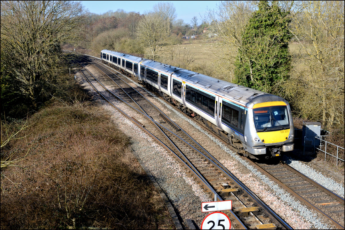 There is a good service for passengers between Birmingham and London with Chiltern, mostly using 2, 3 and 4 car class 168 units. This is the 10.11 from Moor Street to Marylebone, 1H32, at Budbrook Junction on 7 March 2025 with 168325 leading 168214. |
