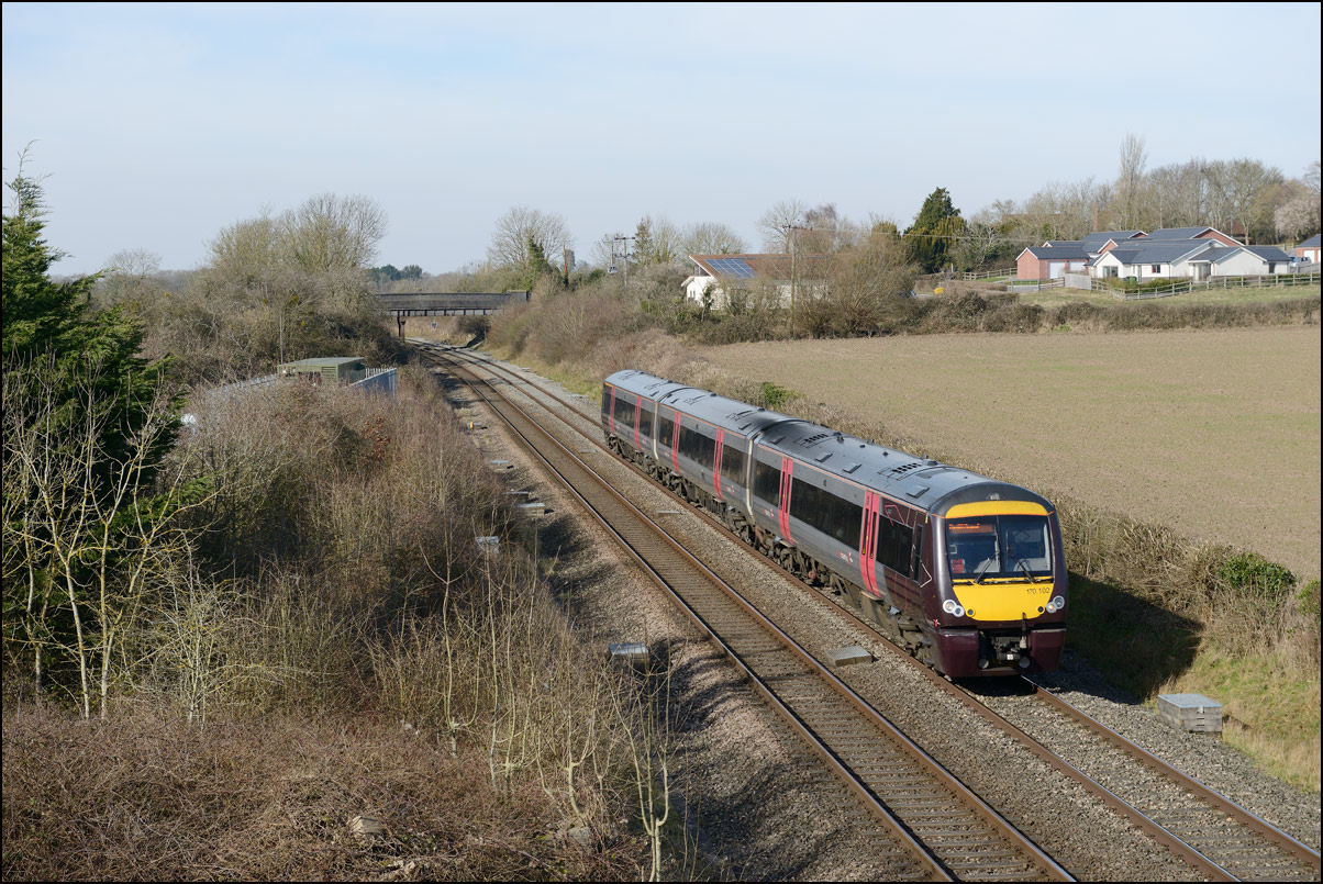 CrossCountry class 170s don't look bad when clean and in good light so I took this image of 170102 at Defford on 4 March 2025 while it was working the 12.07 Nottingham to Cardiff Central service, 1V09. This location was the site of Defford station and now houses a compound used to store p-way supplies for when engineering work takes place in the area. |