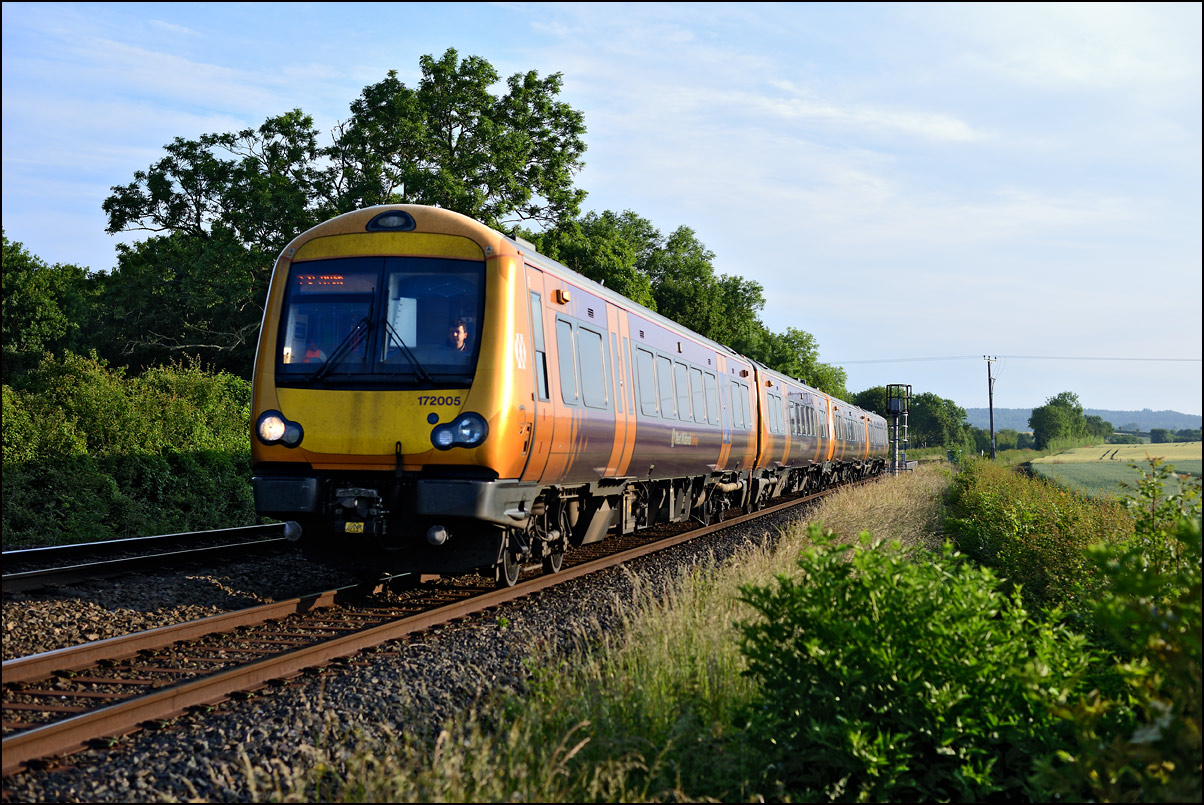 On Tuesday 17 June 2025 one of the very rare daylight ballast trains over the North Warwickshire, 6P50, was shown to run to Stratford-upon-Avon from a possession in the Wood End area before reversing at the terminus and going back to Bescot. A perfect morning was forecast which meant that very few locations would be any good for photography between 6 and 7 o'clock in the morning. I had used this on a farm crossing near Bearley Junction in 2011 so on the previous day walked up the Stratford canal towpath to check it out. It had barely changed so went there on the 17th arriving just in time for this image of 172005 + 172004 leaving the single track at Bearley Junction with 2D01, the 05.51 from Birmingham Snow Hill to Stratford via Dorridge at Hatton North Junction. |