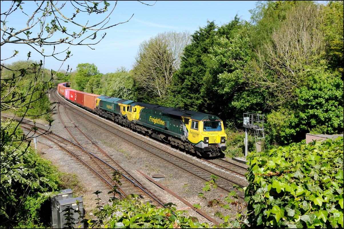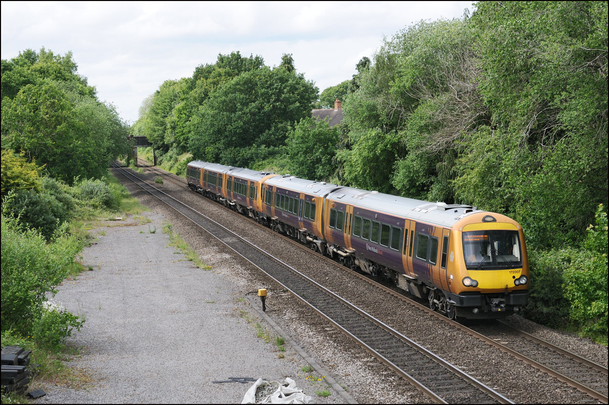 A transit move of former TPE stock was due to pass Hatton during the afternoon of Friday 15 August 2025 and the afternoon Leeds to Southampton Freightliner was routed a few minutes in front of it. Here is 66570 taking its heavy and almost fully loaded train towards Hatton station after a signal check at Hatton North Junction while a Stratford-upon-Avon train crossed over to Hatton West Junction. I took some video footage of both trains with a 5-car Chiltern service passing mid=way through the Freightliner boxes going by. |