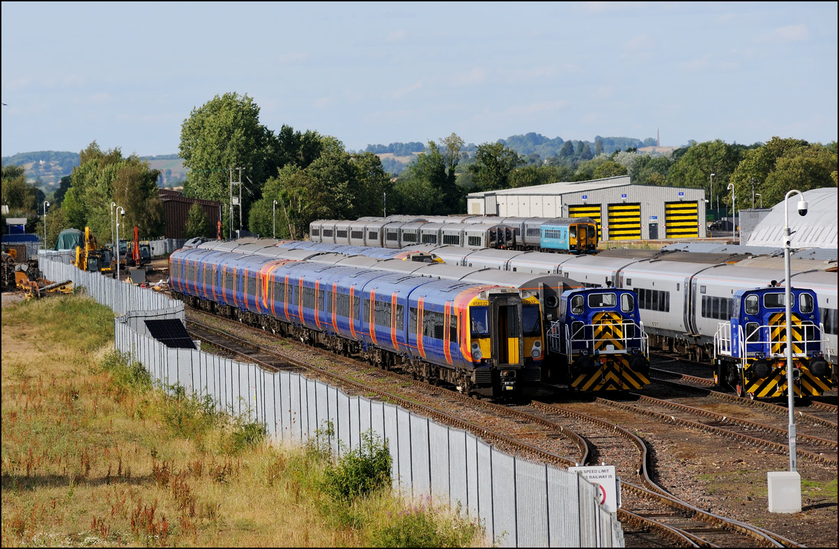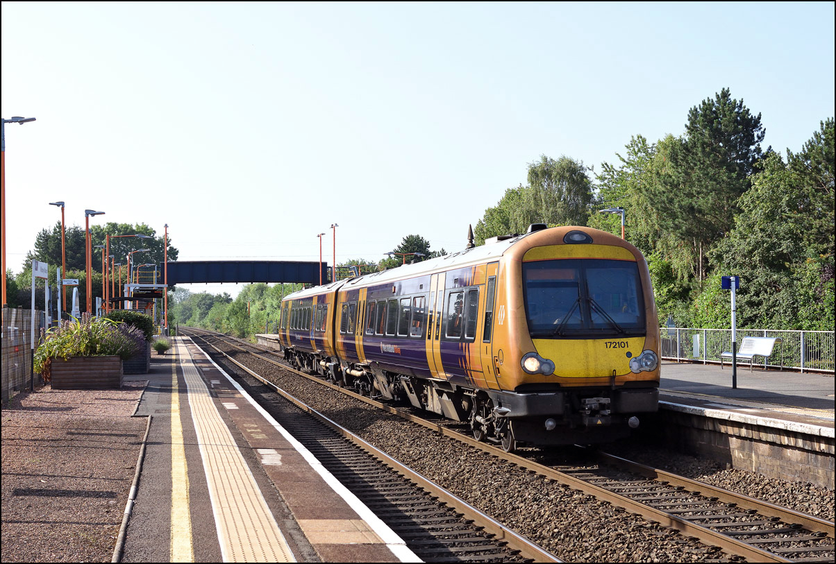 A very unusual stock move from Southall to the Greatest Gathering at Derby was scheduled for Friday 25 July 2025. It involved green 33012, Sarah Siddons, a preserved 4-VEP and the Midland Railway saloon 45029. The timings were such that a shot at Widney Manor seemed a good bet; I had thought of Whitacre Junction but the eastbound shot there is little more than an anonymous tunnel of trees at the moment. To cut a long story short there was a road closure near Hockley Heath with insufficient information and a ludicrously convoluted diversion being signed. I took a chance and went down the closed road to find that I could get as far as Bentley Heath and then make just a simple loop round to Widney Manor. On checking Railcams 5Z35 was standing in Fenny Compton loop and after a phone call to a friend in the know established that nothing was going move any time soon and that the train was to run to Leamington Spa where Sarah Siddons, suffering with hot traction motors after being dragged, would be taken off and dumped in the down side siding. Just time for a quick shot of 172101 with 2V28, the 09.03 Dorridge to Worcester Shrub Hill before going towards Hatton to see what happened. |