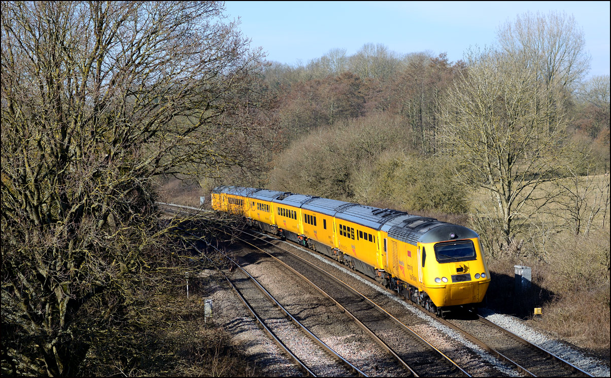 One of the brightest trains on the system is the Network Rail NMT. On 6 March 2025 43062 topped 43013 on a 1Z49 Derby RTC to Reading Triangle Sidings ready to work to South Devon the following day. I took this shot with an 85mm lens to bring out the woodland on Hatton Bank and to show that this shot won't be worth doing when the leaves have appeared. |