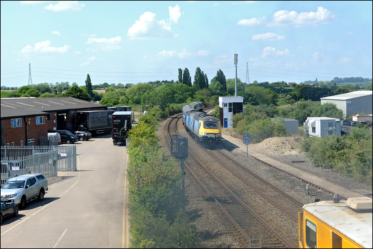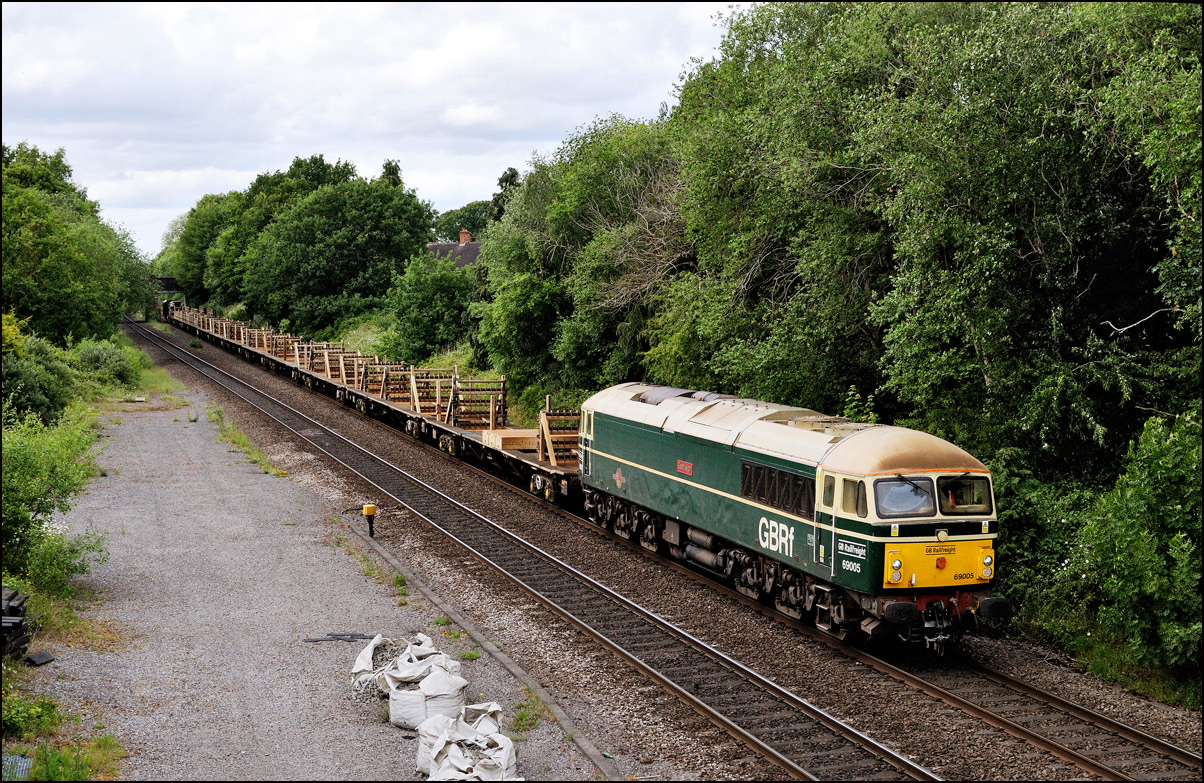The regular 6O01 or 6X01 from Scunthorpe to Eastleigh has been a solid GBRf turn for some years but apparently a shortage of the class in the week commencing 2 June led to class 69 being put onto the service. On Monday someone managed to find 66718 + 66207 but on Tuesday 69005 worked as hoped. As far as I know this was the class's first outing on the train so a photograph seemed to be a good idea. The train sits in Dorridge UPL for around 45 minutes so the obvious place to go was the footbridge at Bentley Heath Crossing. It was running about 15 minutes late and managed to miss clear skies by about 20 seconds as it crawled up to the entrance to the loop on the other side of the bridge. I took a video as 6O01 came under the roadbridge in the background. |