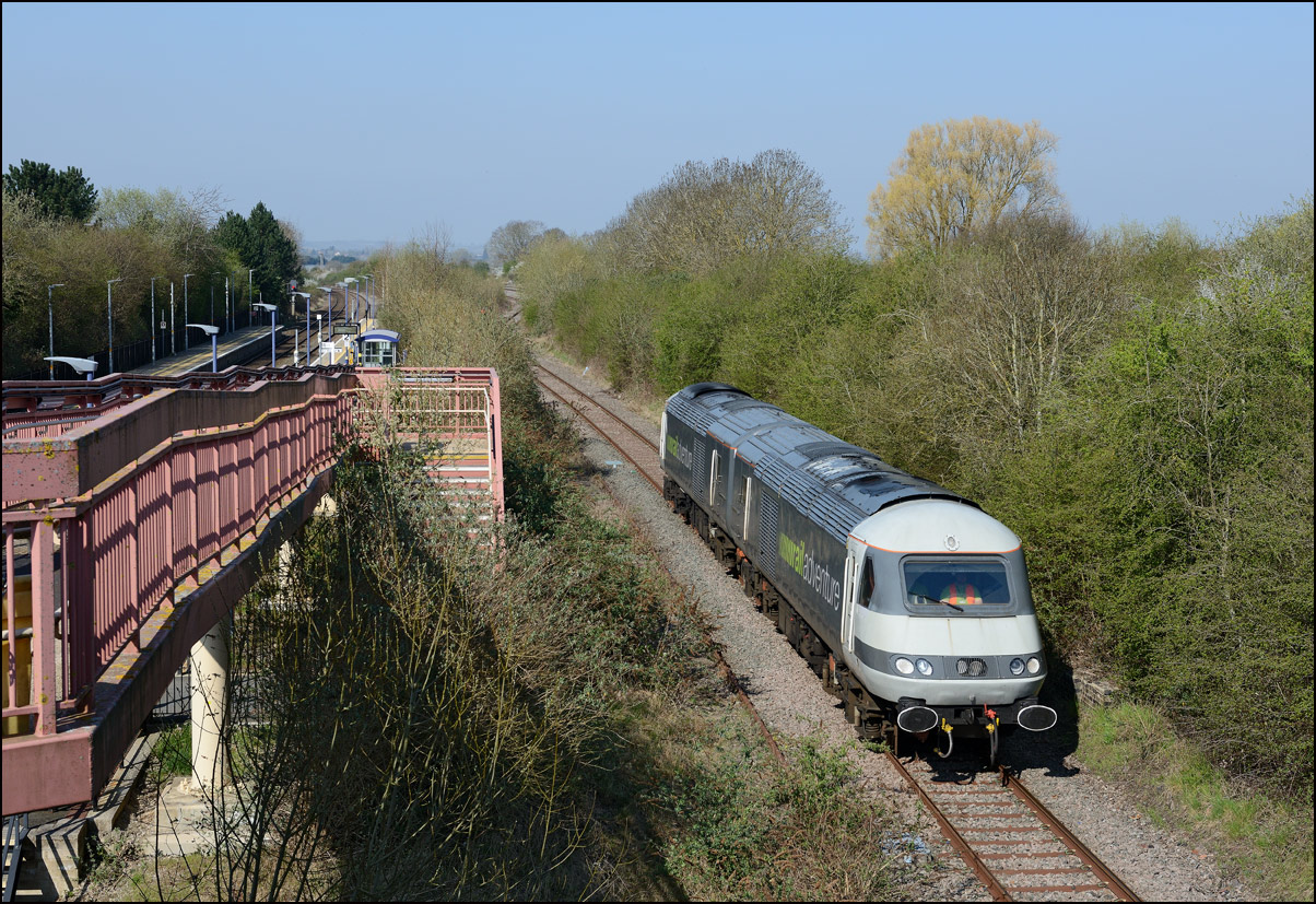 There were some crew training runs between Kings Norton, Long Marston and Worcester using Rail Adventure Power Cars 43465 + 43484 on 3 April 2025. I don't always bother with light engine moves but back-to-back PCs look marginally more interesting and I wanted to check if the Long Marston branch at Honeybourne was free at shadows on a sunny morning. The train, 0T37, ran close to right time but seemed to have been given far too long, 18 minutes, to get from Evesham to Honeybourne North Junction so made sure to arrive in plenty of time. Some 18 minutes before the booked time the pair of power cars crossed over onto the branch from the up main line. |