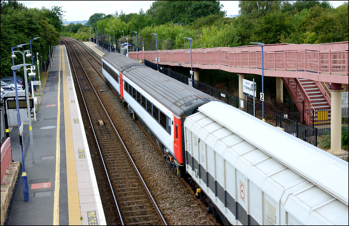The former TPE loco-hauled sets are moving to Chiltern Railways to replace the ageing Mk3 stock. I wasn't able to photograph the first train but another ran on Friday 15 August 2025. The locomotive was 68020 leading the 5 coaches including the stylish DBSO which will lead south when the stock enters service. The sun managed to stay out and I was pleased about this for a first shot as I couldn't be bothered to go further north towards Birmingham where the angle of the light may have been more conventional. Some video footage can be found with the Leeds to Southampton Freightliner coming along first. |