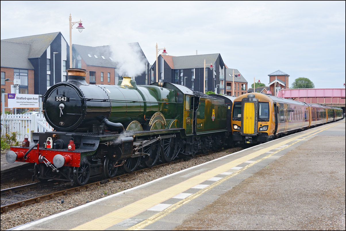 The regular Shakespeare Express to Stratford-upon-Avon ran on Sunday 27 July 2025 starting with a trip from Birmingham Snow Hill to Worcester led by 37240, Castle 5043 being on the back of the formation. The Castle led from Worcester to Hatton where 37240 took over again after a reversal and brought 1Z65 to Stratford. A five-car class 172 was already in platform 2 meaning that this shot was the only one available. Still, it's always good to see a locomotive-hauled train here; something increasingly unusual these days. |
