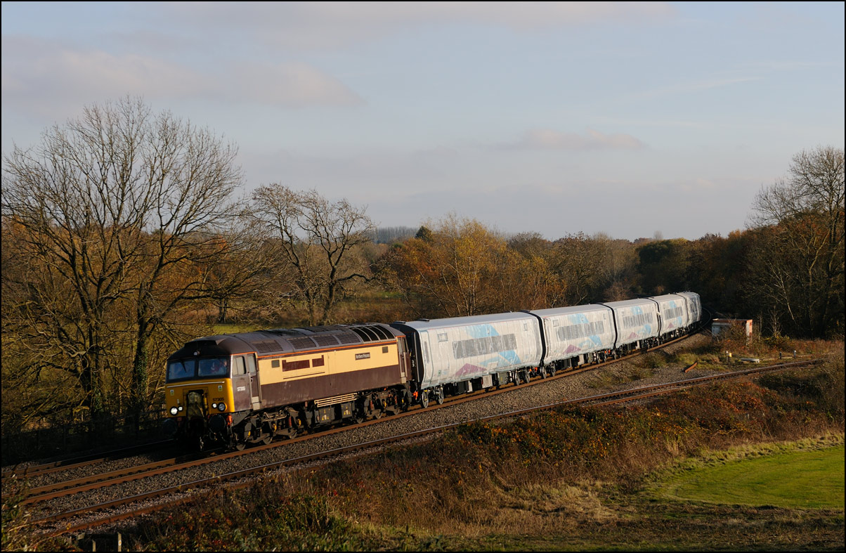 The second train to Long Marston on 24 November 2025 looked at one time not to be running. It was a 6V52 from Wembley taking new GBRf box wagons for temporary storage but when it reached 230 minutes late a "Cancelled" note appeared on RTT. A bit later it moved, now as 4V52 with 47739 in charge. Some time was made up as it approached and went around Birmingham and with a 60 minute layover at Worcester Shrub Hill not used it was exactly 120 minutes late leaving Norton Junction. This consist made a very welcome change for me from various repetitive units so I went to Honeybourne where, given an almost total lack of daylight, it was handy that the train would be moving very slowly. It was a pain that a bright sky appeared in the left background at just the wrong moment but still worth but it worked out reasonably well in the end. |