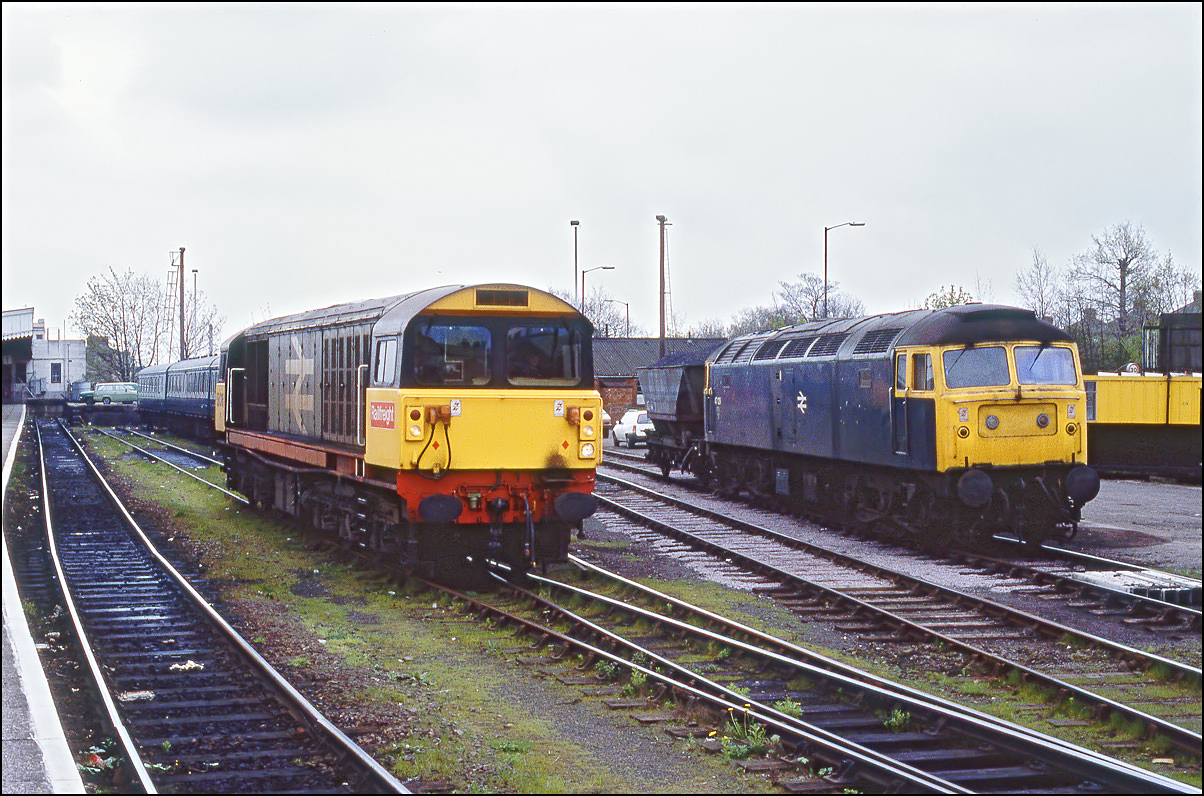 My final image from Leamington Spa on 30 July 2025 was taken as 50007, 46035, 50033 and L12 Sarah Siddons were ready to leave the down DMU siding at Leamington Spa. I have taken a few other shots of locomoitves here over the years and this one of 58016 alongside 47129 on 4 May 1985 is my favourite. The class 58 was waiting to replace 31170 on a down freightliner, a regular occurrence at the time although not often with a class 58. I took a couple of slightly disjointed video sequences of the class 50s etc |