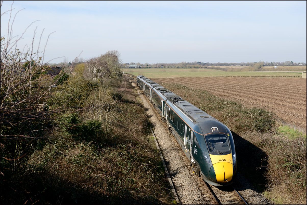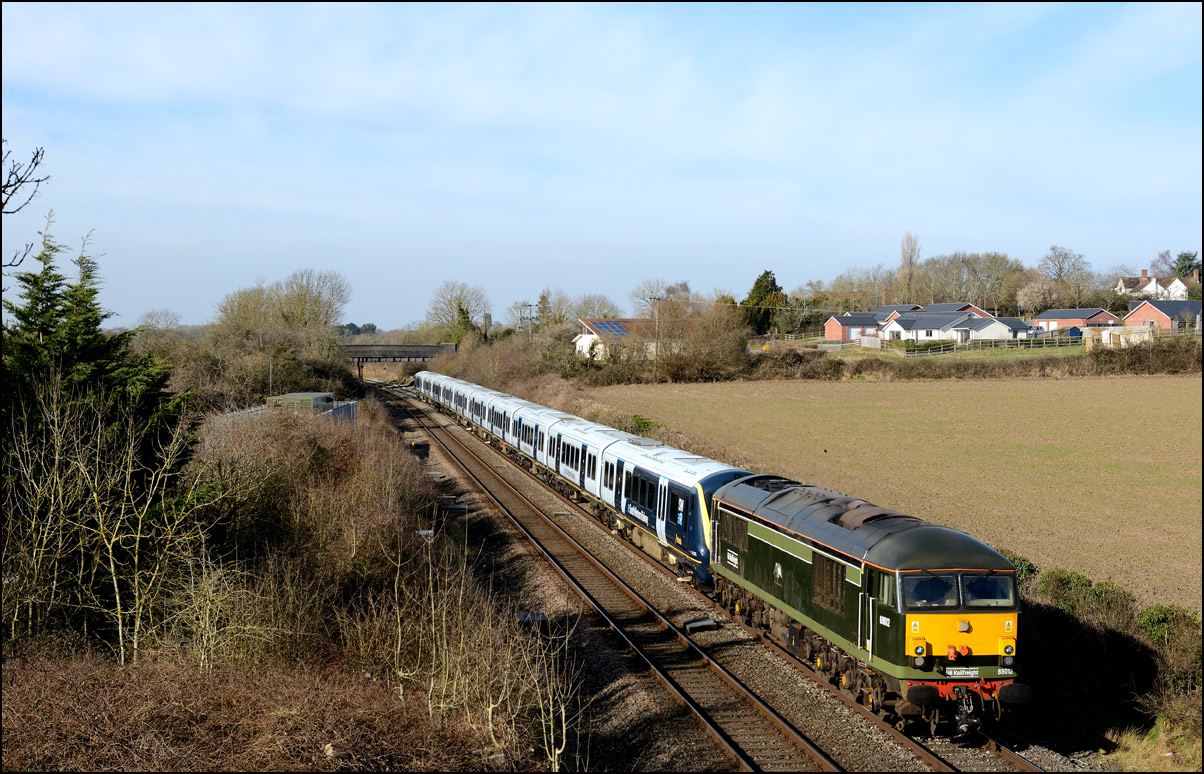 A Long Marston to Wimbledon Park Sidings stock movement took place on 4 March 2025 with a colourful locomotive doing the honours. Given just about guaranteed sunshine it would have been rude not to have gone out and I chose a location between Evesham and Pershore for my first shot where it was unlikely a crowd would be present. Even GWR IETs look reasonable in bright sunshine and here is 800034 working 1P28, the 11.57 Great Malvern to Paddington which on this occasion started from Worcester Foregate Street because of previous late running. |