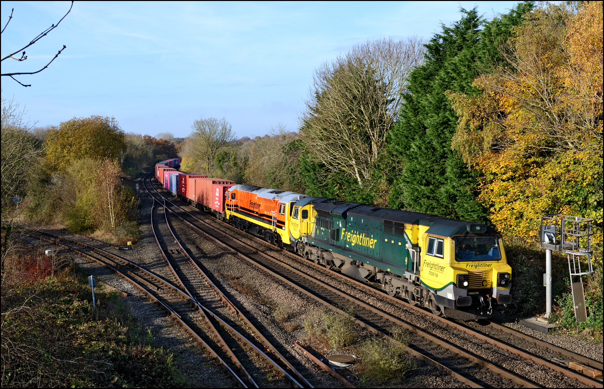 As this was my first sighting of a class 68 in the new Chiltern colour scheme I took a third shot at Honeybourne on 4 December 2025 as the DVT led the Mk5 set to the stop board visible on the left of the Long Marston line. The autumnal colours are still quite intense here even if poor light but had the sun been out it would have been in wrong place and casting heavy shadows over most of the scene. Note the walkway and and foot crossing under the 2nd coach that was installed earlier in the year to provide a safe route for railway staff to access the token hut from Honeybourne station. |