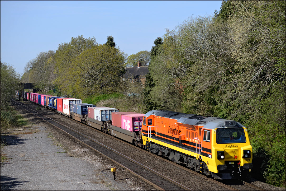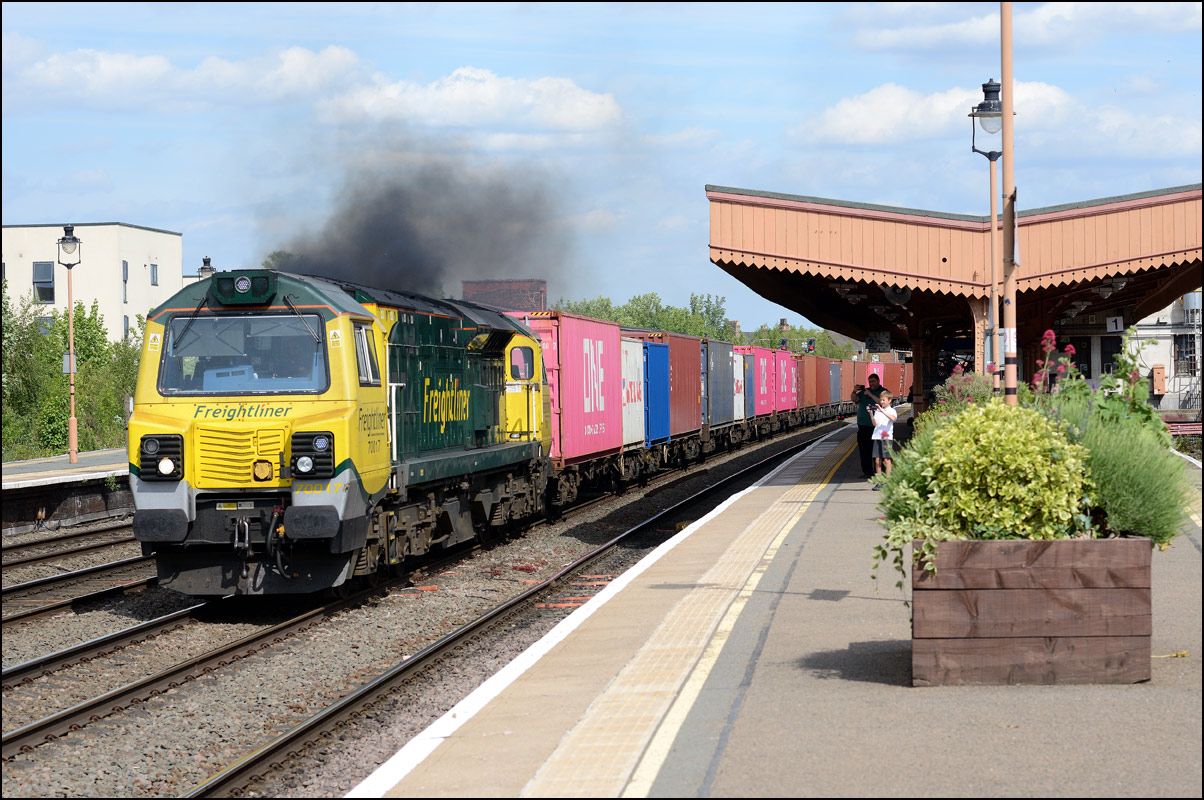 Next along at Leamington Spa on Friday 23 May 2024 was 70017 with 4M61, the 12.56 Southampton to Trafford Park Freightliner. The sun was in and out but held on nicely as the driver opened up when the signal cleared for the speed-restricted junction to the Coventry line. Not exactly an environmentally ]# exhaust but it made for a decent image. |