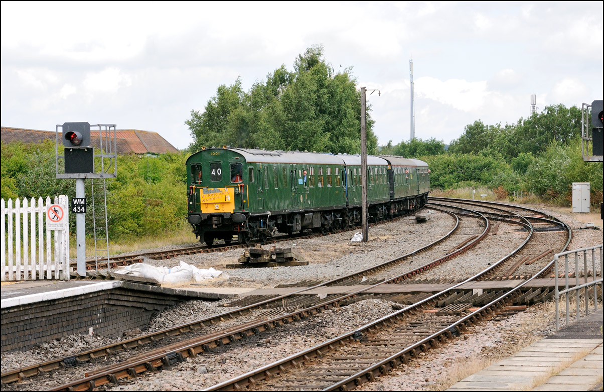 Turning around from the picture shown above, this is the scene as MPV 98959 leaves Stratford-upon-Avon en-route to the West Midlands. The pile of sleepers just visible beyond the train roughly marks the site of the proposed steam centre it is hoped to build here. This would apparently be a major attraction for the general public and would include a turntable to avoid the need for either a trip to Hatton and Dorridge for reversal via a triangular junction, or tender-first running. There would also be a servicing facility operating as an outpost to the museum and workshops at Tyseley. The planning application for this site was recently withdrawn to allow for the plans to be re-drawn. The original submission made insufficient allowance for parking and for adequate access and egress to and from the site. Anyone who has tried to leave Station Road in order to head away from Stratford-upon-Avon at a busy time will know the problem faced here... |