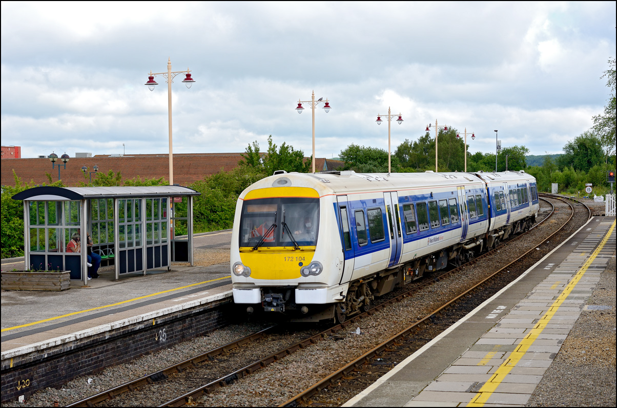 I was walking along the towpath of the Stratford-upon-Avon canal on the morning of 18 August 2018 when I saw a reliveried class 172 about to enter Stratford station. I assumed that it was the 08.21 arrival from Stourbridge Junction and after returning home worked out that the same unit should return on the 14.21 arrival. Luckily, a friend texted me to say that it was actually on 2D40, the next service which ran via Dorridge and Hatton North Junction which meant that the train I had seen earlier was 5D70 from Tyseley depot running early. I had a walk to the station in the afternoon taking my Canon G10 and arrived a few minutes before 172335 in its new colour scheme arrived with 2D40. |