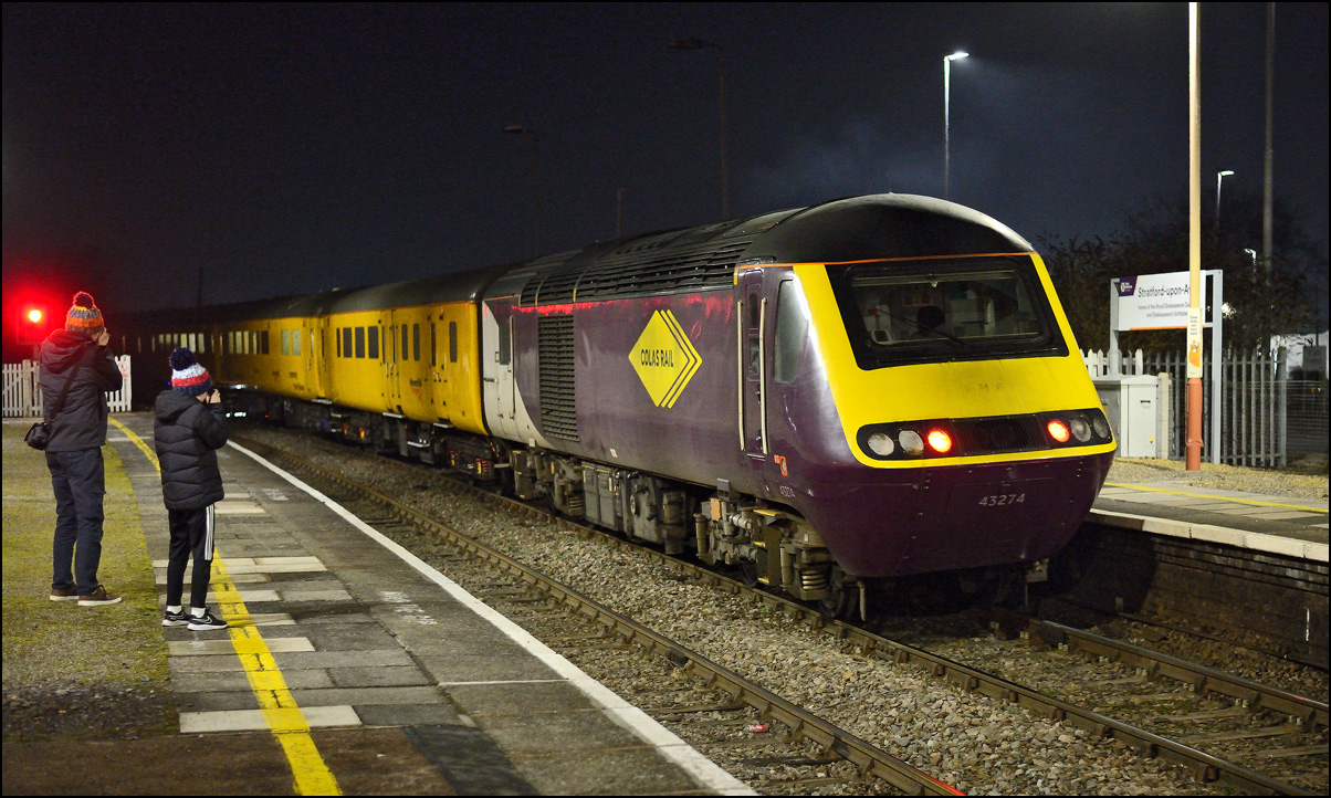 Colas Rail has recently acquired 2 of the former EMR power cars for use on trains with, I believe, more to follow with a view to dispensing with most locomotive haulage from the Network Rail test trains which they operate. On Tuesday 3 November 2020 the monthly test train from Tyseley, 1Q48, utilised 43050 + 43060 still in the EMR livery but with vinyls showing their new operator until they can be repainted. As this was the first time that HST PCs have been to Stratford-upon-Avon on such a working I went to the station for some shots and was surprised to be the only photographer there. The new station lighting here very effective and I used my Nikon D800 hand held with settings of ISO 4000, 1/125 second with a 50mm lens set at f2.8 to achieve what I think is an acceptable result. |