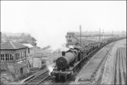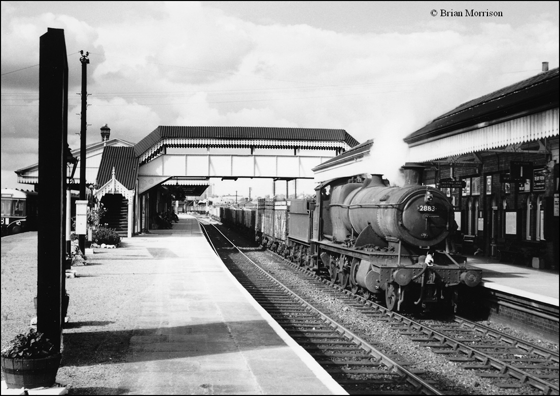 Despite the procession of passenger trains to and from the West Country and South Wales, there were still freight services for the hard-pressed signalmen to fit in on the route through Stratford. Here is GWR 2-8-0 2883 from Tondu restarting a freight for Severn Tunnel Junction and passing through Stratford station. Virtually all down freights would have been routed into the down goods loop for watering and to get them out of the way of passenger trains and the rear of this train can be seen snaking onto the main line as it leaves the loop. There was less flexibility for up trains and if a faster service was approaching from behind, a freight would have had to have been propelled into the refuge siding by the West Box after running into the station to clear the appropriate points. These immensely powerful freight locomotives sounded magnificent when working hard although at this point 2883 would have been running very slowly until the last wagons had cleared the loop. Even then, it would have run cautiously as the gates of the Evesham Road crossing a little further south may not have been opened and the distant signal would probably still have been at caution. Brian Morrison |