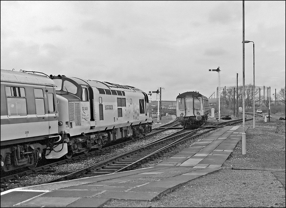 An earlier visit to Stratford by 37418 was under more unusual circumstances. The locomotive hauled a private charter to mark the retirement of a senior executive from his post within an international oil company. As an added point of interest, 37418 was renamed "Gordon Grigg" before the train departed from Kensington Olympia on 11 March 2002 form whence it ran to Stratford where the guests alighted and were ferried to a hotel on the outskirts of the town for lunch. The ensemble is here seen stabled in platform 2 headed by the specially cleaned ETH machine. |