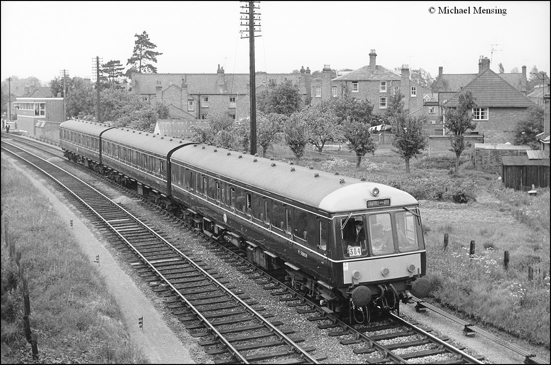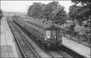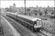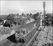 This is the view in the opposite direction from the one above on 23 May 1964. The northbound DMU, headed by single unit 55009 which was still in use in the area until withdrawal in the 1990s, is the 17.50 Worcester Shrub Hill to Stratford-upon-Avon. The train is passing through the Racecourse Station and the spur to the SMJ can be seen at the platform end and the splitting signal controlling the junction is visible above the third coach. The trackbed here is now a cycleway and footpath, but is very difficult to recognise any features to make an up-to-date comparison. Michael Mensing |