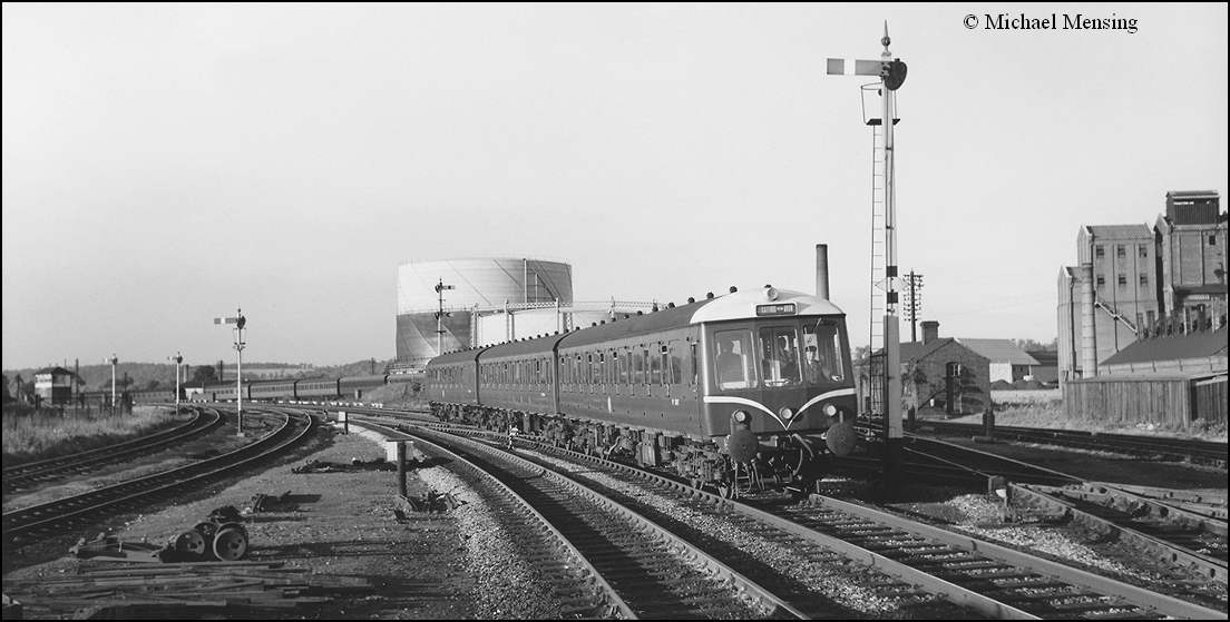 I am so glad that it wasn't only the main line expresses that were photographed in the 1950s. DMMUs, so often ignored and indeed despised by the more blinkered enthusiasts of time were vital to the railway and have only recently been given the attention that they deserve. Here is a 3-car Western Region suburban unit forming the 15.05 Birmingham Snow Hill to Stratford-upon-Avon service arriving at its destination on Sunday 10 October 1958. At least two passengers can be seen on their feet ready to alight once the train had stopped in the platform. As always, the infrastructure holds as much interest as the train, with the gasworks and gasholders prominent in the right and middle background, the engine shed visible below the gasworks and the East Box, which controlled all the signals, visible at the extreme left hand edge of the picture. Michael Mensing |