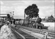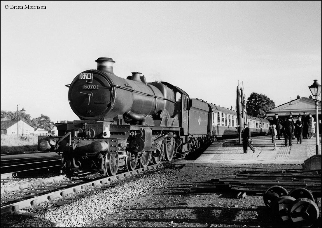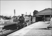 This picture, also taken on 16 August 1958, shows Stafford Road's Castle 5070 Sir Daniel Gooch preparing to leave Stratford-upon-Avon with the 11.15 Newquay to Wolverhampton train. The usual practice would have been for the locomotive to come onto the train at Bristol after being serviced following the southbound run from Wolverhampton earlier in the day. There is a strong possibility that a pilot locomotive would not have been required to assist this powerful locomotive up the 1/75 to Wilmcote; it is more likely that an engine would have come from the siding alongside the West box and give the train a shove through the reverse curves immediately outside the station and then up the bank. My parents did not live far from the station and I can well remember hearing these trains start from the station, accelerate along the short downhill stretch through Bishopton and then become slower and louder as the gradient began to bite on the climb north. Brian Morrison |
