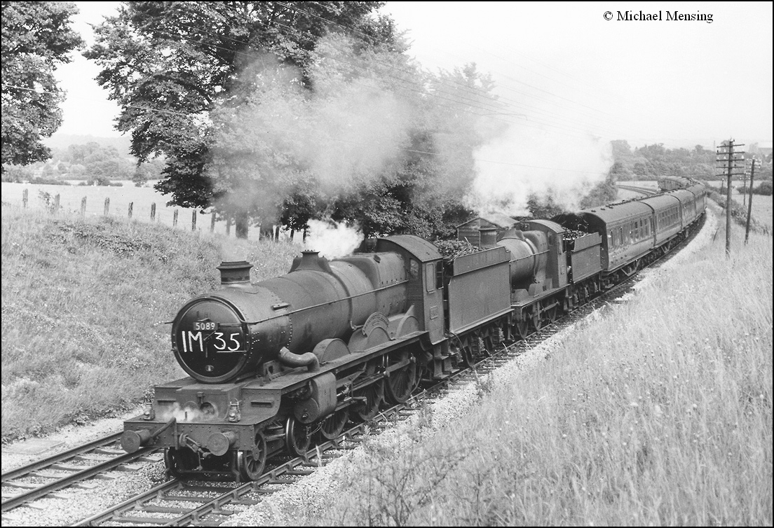 Here is a photograph of Stratford's other "Baby Castle", 2251 coupled inside Castle Class 4-6-0 5089 Westminster Abbey. The train is is the 11.15 Ilfracombe to Wolverhampton Low Level climbing Wilmcote bank on 27 June 1964. The help of the Collett 0-6-0 will be appreciated on this 1/75 gradient and also on the 1/150 of Danzey Bank, but then the crew of the train engine will be in for a bit of a shaking as the longer-legged Castle gets into its stride on the run into Birmingham. Most mainline expresses to the South West on this route had ceased at the end of the summer timetable in 1963 but the line through Stratford-upon-Avon was still used for some summer Saturday trains over the following years. Michael Mensing |
