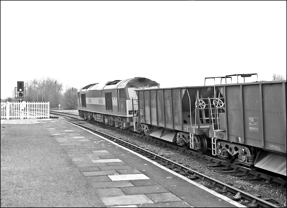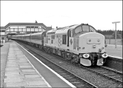 A much more recent rare visitor to Stratford-upon-Avon is seen here. D9000, Royal Scots Grey came to the town on the early morning of 9 December 2000 with a railtour from Shirley, on the North Warwickshire Line, to the Lindum Fayre at Lincoln. When I was a young enthusiast in the 1960s, I would no more have dreamed of a seeing a Deltic here than Sir Nigel Gresley or Mallard. In fact, there are now very few classes of locomotive, steam or diesel, not to have visited the town. The train, reporting number 1Z55, is here seen at 08.15, just before departure to Lincoln via Hatton West to North Junctions and thence Birmingham, Water Orton, Hinckley, Leicester and Nottingham. I did also take a colour transparency of D9000 but the lighting was a little difficult with the sun rising and illuminating the other side of the train. After returning from Lincoln, the train departed from Stratford shortly before 10pm and I did stand outside my house, about a 5 minute walk from the station, to hear it roar away up Wilmcote Bank and back to Birmingham. |