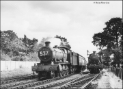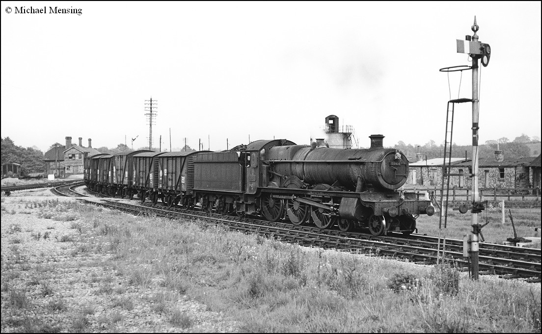 I mentioned above the 1960 curve built from the SMJ to the GWR Cheltenham line. Here is 6944 Fledborough Hall on the curve having just passed through the SMJ's Old Town station. Despite the limitations of a single track railway from Fenny Compton to Stratford-upon-Avon, this spur was heavily used for some 5 years after it was built. The route had value in that the stiff climb of Hatton Bank was avoided for northbound trains and it offered a more direct line for the iron ore trains from Banbury to South Wales. It was also valuable for any trains from the Oxford line needing access to the Cheltenham line as there was no direct connection between the two at Honeybourne. Any train running from Oxford to Cheltenham via Honeybourne would have had to make a long propelling move of almost a mile from Honeybourne station along the East Loop so that the locomotive was clear of the points by the East Loop signalbox. The train was then able to be routed over the junction to gain access to the Cheltenham line. The was clearly a procedure fraught with difficulty and which had the potential to cause delays and which was avoided by running from Fenny Compton to Stratford via the SMJ and the new spur. Michael Mensing |