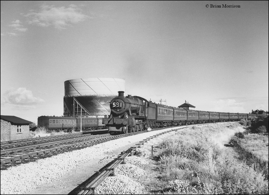 Here is one of Hawksworth's modified Halls, 6986 Rydal Hall, shortly after leaving Stratford and passing the East Box having just crossed the Stratford-upon-Avon canal. This train was neither piloted or banked, which was quite unusual on Saturday evenings; there was a northbound train every few minutes in the peak hour between 6pm and 7pm and the assisting locomotive gave a bit of extra speed on the bank to Wilmcote, plus a bit of added security. Given the almost complete lack of exhaust from the locomotive, the evening of 16 August 1958 must been a hot one! To the left of the locomotive is a rake of maroon stock stabled in the siding alongside the Down Goods Loop, this appearing to be a short non-corridor set used on one of the local services perhaps to Honeybourne or Worcester. The gasholders were fed from the municipal gasworks, which was just out of site to the left of the picture. Regular trains of coal fed the works, there being a dedicated long siding from the yard. I can well remember the awful smell generated by the gasworks when my father and I fished in the canal; it was an unfortunate coincidence that the best fishing spots were close to the source of smell...Brian Morrison |