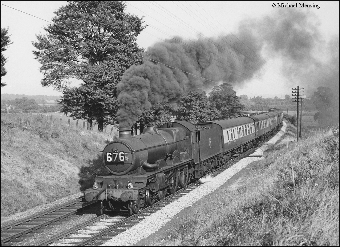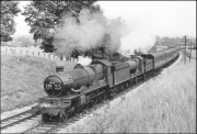 By way of contrast to the photograph above, this beautiful picture shows 7019 Fowey Castle, with a flat-sided tender, making a lot of visible effort on the climb to Wilmcote with a relief to the northbound Cornishman on 15 June 1957. The locomotive appears to be completely steam tight and the driver, on this dry evening, clearly had confidence in his engine and fireman to tackle the bank unaided. Wilmcote Bank is relatively short and there is a downhill stretch at Bishopton before the gradient starts to bite and keen drivers really made the most of this - I can remember listening to trains leaving the station in the early 1960s and being fascinated to hear them rapidly pick up speed once away from the reverse curves before becoming much louder and slower as they climbed away. Michael Mensing |