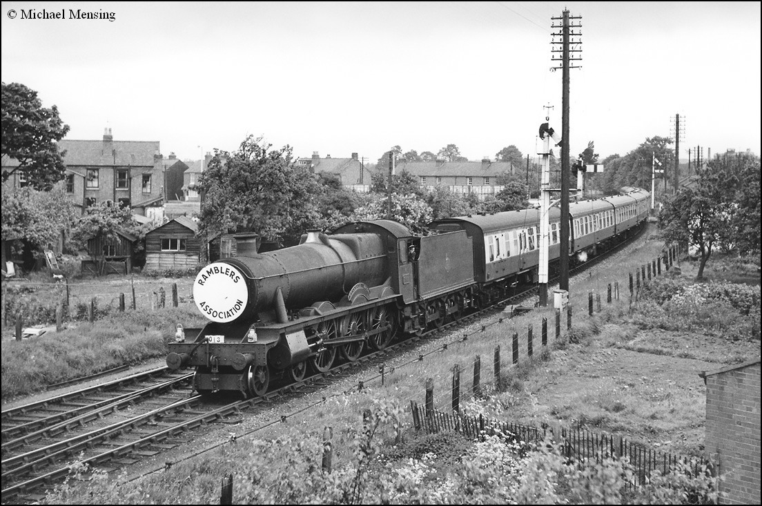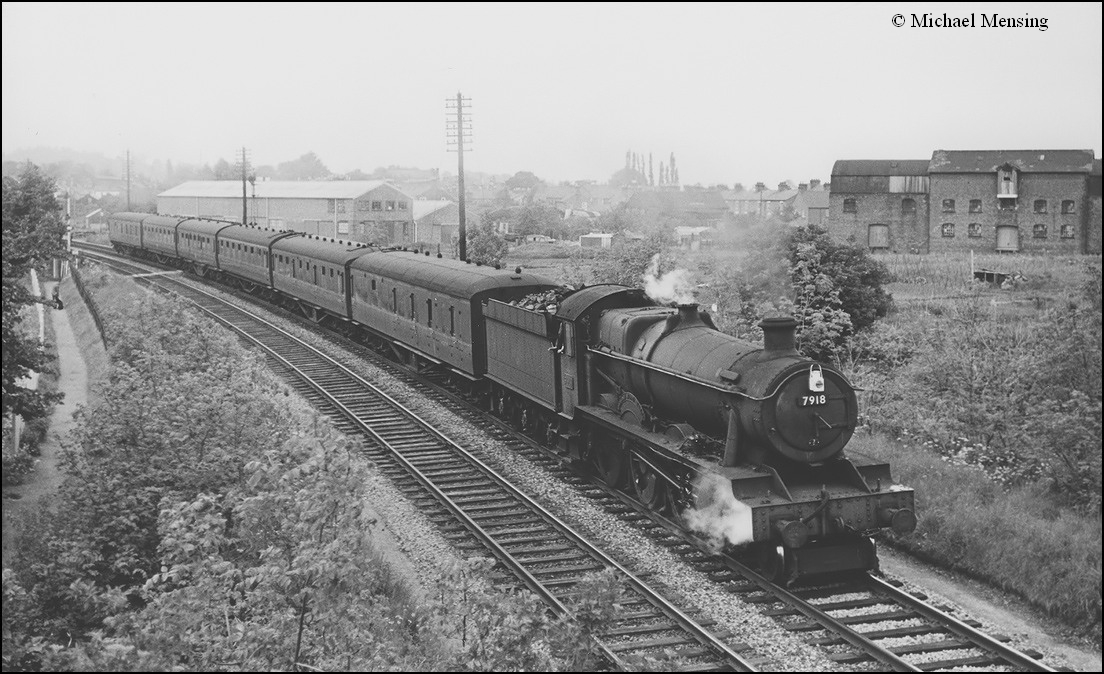 Going a little further south from the photograph above, here is one of the locomotives I saw more than most, Modified Hall 7918 Rhose Wood Hall, about to pass the platforms at Stratford-upon-Avon Racecourse which, on this day had been open for business. The train is the 17.45 Birmingham Snow Hill to Evesham service on 23 May 1964 with its usual load of six assorted carriages. The spur from the SMJ joins this line at the other end of the station and the footpath visible under the fourth coach is that to be seen behind the 3-car DMU in the picture of the northbound train taken from Sanctus Road. Michael Mensing |