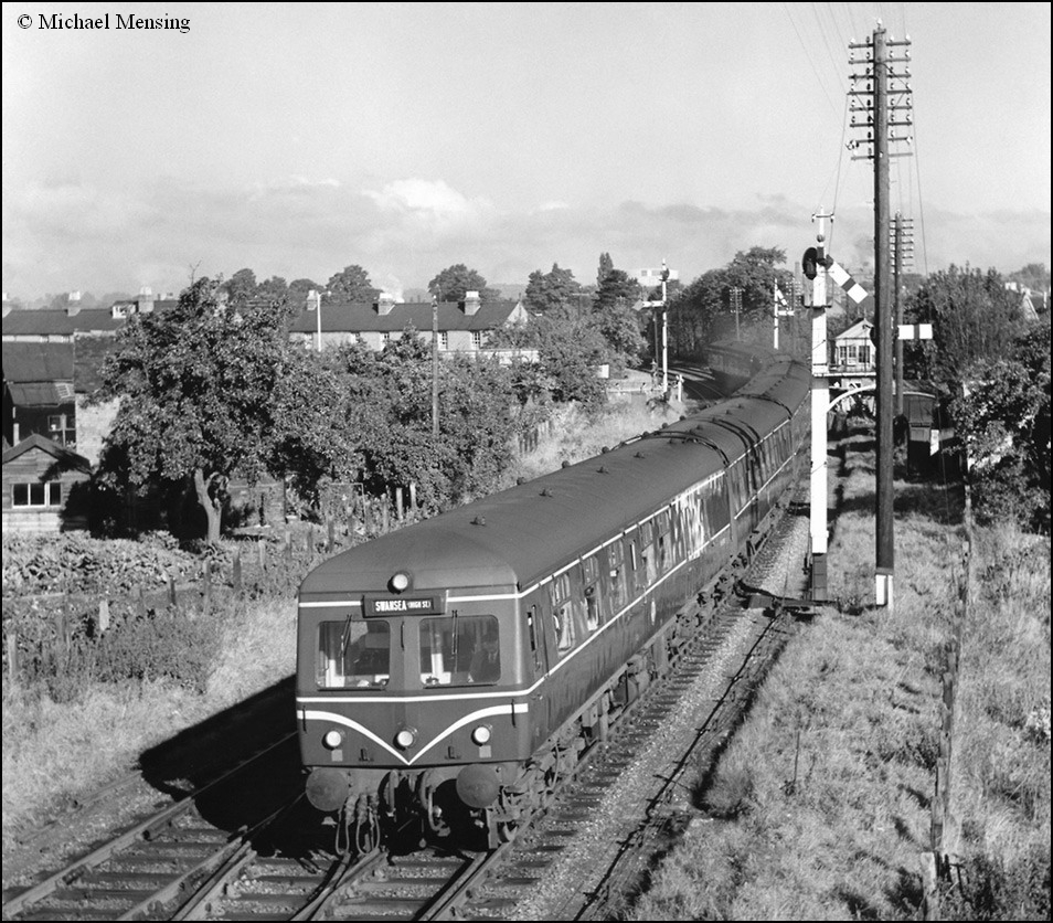 This earlier picture from Sanctus Road, shot on Sunday 12 October 1958, was taken from a slightly tighter angle than the one below and the GWR signalbox at the Evesham Road crossing is clearly visible. The train is the 09.00 Birmingham Snow Hill to Swansea High Street train formed of 3 x 3-car Cross-Country DMUs - very much the norm on some services at this date. Stratford's gas holders can just be made out over the signal on the up line protecting the crossing and the works supplying them can just be made out immediately to the right of the first telegraph post. The leading unit has had the "speed whisker" applied; this being an earlier version of the yellow warning panel and the later full yellow end designed to improve track safety for permanent way workers more used to a much noisier form of traction. In my opinion, these whiskers enhanced the look of the units and nicely contrasted with the green livery which, arguably, was the finest carried by any DMU. Michael Mensing |