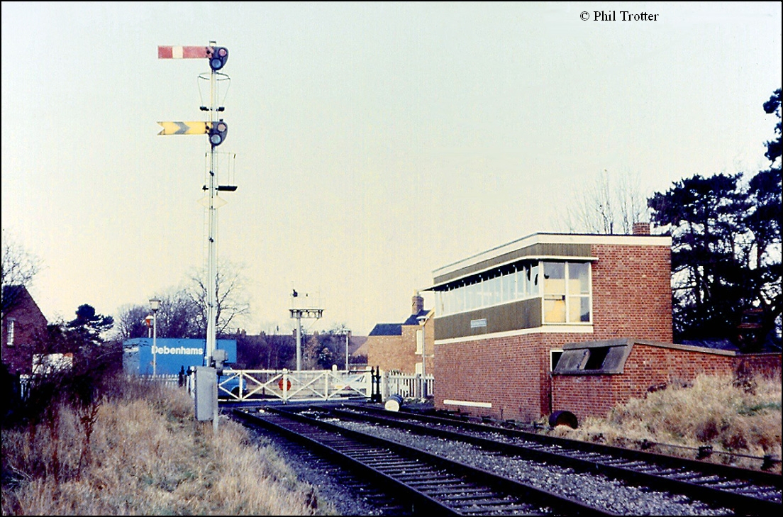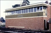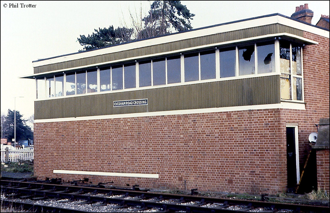 I have mentioned the Evesham Road Crossing Box in several of the captions to this section. Here is a photograph of the box taken after closure of the line south of Stratford-upon-Avon although before the signalling was dismantled. This is the 1960-built structure which replaced the earlier GWR building; the former box was much smaller and sat closer to the road than the new one. I have very fond memories of the road crossing here as it lay on my way to school from 1960 to 1971, although I never plucked up courage to ask if I might visit it. The gates were operated by the traditional capstan and I always hoped to see the signalman standing over the wheel carefully watching for a gap in the traffic as this meant that a train was imminent. There was a morning coal train which ran between 08.30 and 09.00 and I was just occasionally late for school when I had to wait for this to cross the road. I sometimes waited even if the gates were open when I arrived...Phil Trotter |