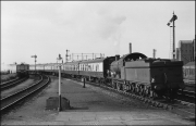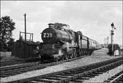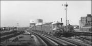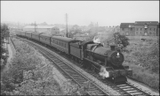 I mentioned in the caption to the picture of 5070 that a Castle might not need the help of a pilot locomotive all the way to Birmingham. Here is the proof. Stratford's Collett 0-6-0 2257 is here seen at the rear of the main portion of the northbound Cornishman on 23 May 1959. I did like this engine and its sister 2210, both of which were shedded at Stratford. They had a lovely exhaust note when being worked hard and could accomplish a good turn of speed when required. The train locomotive on this occasion was coincidentally 5070 Sir Daniel Gooch, the same Castle as in the picture above. The DMU on the left of the picture, in the "Cold Store" siding is no doubt waiting for the express to clear the section so that it can pull forward before reversing into one of the departure platforms, probably No. 3, to form a northbound connecting service. The building on the extreme right of the photograph is Stratford's municipal gasworks, feeding the well-known and sadly now demolished gas holders.Michael Mensing |
