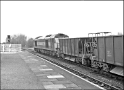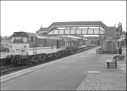 Another Western to visit Stratford was 1052 Western Viceroy. This one came at the head of a Plymouth Railway Circle Railtour on 29 March 1975 and was photographed during a photostop in platform 2 having come north from Cheltenham. The two aspect repeater signal on platform 1 is worth a second look. The station was on a slight curve with a high roadbridge immdediately on the end of the platform. This made sighting difficult fro drivers so this repeater was added. This device always fascinated me on my frequent visits to the station in the early 1960s - a signal moving without wires creaking? Whatever next! Westerns were never seen at Stratford on timetabled services, but I am told by one of the signalman from the Evesham Road Crossing Box that occasional visits were made by the class in the 1970s on trains from Birmingham used for brake tests around Toddington. Sadly, I didn't see any of these and as far as I am aware, no photographs exist of them. In fact, I have been quite unable to find any photographs at all of diesel-hauled freight in the immediate vicinity of Stratford-upon-Avon in the 1970s and should be most grateful to hear from anyone that either has or knows of any.The late Bert Wynn |