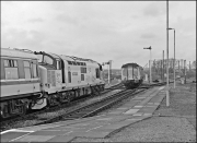 Vintage Trains' Clun Castle was unavailable for the Shakespeare Expresses for the second week of the season on 8 August 2021 with class 20s 20142 + 20227 deputising once more. The weather was dull and drizzly so I went to Stratford-upon-Avon GWR for a record shot as 1T50 arrived and the locomotives performed their run-round. Here is the train of many colours arriving in platform 2 with a decemt load of punters aboard; not as many as if a steam locomotive were on the front but still a worthwhile loading. The woodpigeon on the lamp standard doesn't seem bothered by the whistling pair a few yards away. Here is a view from a similar spot in May 1991 with 20903 + 20902 heading a weedkilling train. |