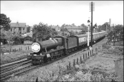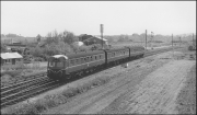 This picture dates from 30 July 1964 and shows the difference in the signalling layour near Sanctus Road once the 1960 signalbox was operational. The splitting bracket signal controlling the junction to the SMJ is now on the north side of the level crossing and, unusually, the arm showing that the road has been set for the SMJ is lowered, the train being routed to Fenny Compton via Kineton. The officers' inspection salon is hauled by small prairie tank No. 4165 which, by this time, had lost its smokebox number plate. It is apparent that some land has been sold in the left-hand background and a pair of semi-detached houses has been built on the site. R.J.Buckley |
