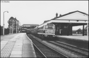 This exceptionally rare photograph of a diesel-hauled train arriving at Stratford-upon-Avon in 1964 shows D5695, latterly 31265, in the station on 11 June of that year with a special train from Bury St. Edmunds. The overall canopy roof on platforms 2 and 3 is still intact; it was later removed prior to a visit to the town by HM the Queen as it was by then in a pooor state. The DMU in platform 1 is a service from Birmingham terminating here - if it had been going further south the repeater signal on the platfrom would have been in the "off" position. I should like to repeat my plea for any similar material; it has been virtually impossible to find photographs of diesel locomotives around Stratford and I should be most grateful to hear from anyone who knows of such pictures - particularly if they show timetabled freight services. R.J.Buckley |