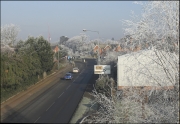 This is the scene from the bridge over Sanctus Road on 7 February 2007, some 30 years after the railway was dismantled. It proved slightly more difficult than I envisaged to find some reference points from Michael's photograph of Henshall Hall and it was not possible to use an exactly similar angle because of the large silver birch tree. The row of cottages below the red crane is about the best reference although the row of Leylandii almost obscure them. The crane is working on a building site alongside the line immediately to the south of the station, almost opposite the viewpoint from which the first photograph in the section was taken. There are periodical letters in the Stratford-upon-Avon local newspaper demanding that the line here is re-opened, although for what purpose is not too clear. If one examines the layout of the roundabout in the background of this photograph, it is clear that space has been left for a single track railway to be constructed should it become strategically necessary. |